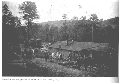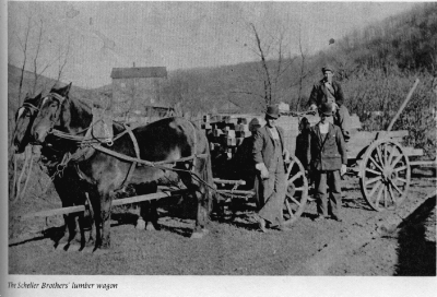Doc and Sam, the two horses pictured, were owned by George and Charles Scheller. A sawmill owned by the Schellers was located down Burk Holow on the John Bower farm in 1908. They also had a mill operation at the Henry Hoppert farm.